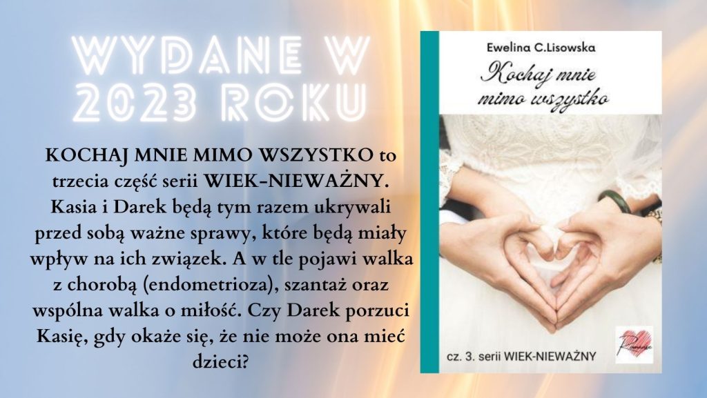 Rok powitaliśmy z trzecią częścią romansu współczesnego WIEK-NIEWAŻNY. Trzecia część serii nosi tytułu KOCHAJ MNIE MIMO WSZYSTKO i nie brak w niej silnych emocji. O czym świadczą recenzje Czytelniczek.