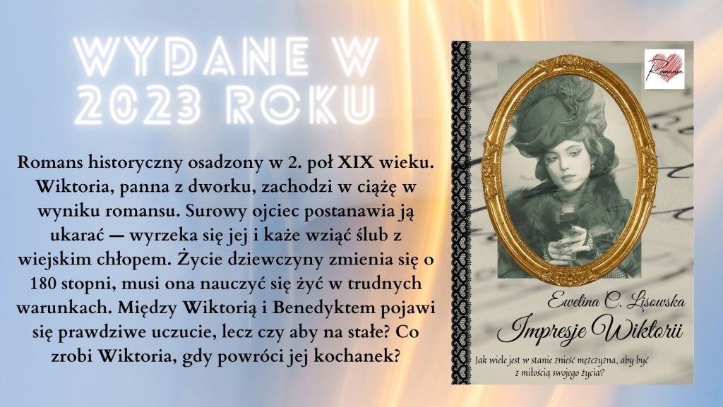 Następnie do publikacji weszło drugie wydanie „Impresji Wiktorii„. Wzbogacone o 300 tys. znaków ze spacjami, nowe wydanie romansu historycznego, zostało opatrzone nową okładką. Czyś nie jest urocza? 😀