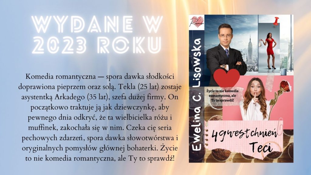 Autorka romansów Ewelina C. Lisowska napisała w tym roku cztery nowe książki. Nie są jeszcze gotowe do publikacji, niemniej jednak istnieją już w swoim pierwszym stadium rozwoju. Co dobrego pokaże nam autorka?