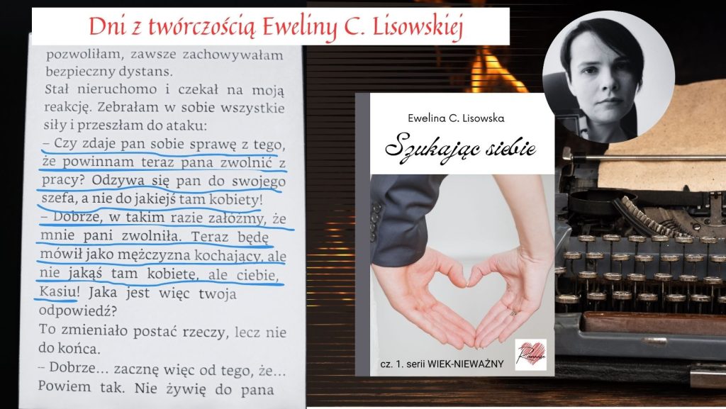 „Wiek-nieważny” to miała być moja pierwsza i ostatnia książka, którą zdecydowałam się napisać i wysłać w świat. Zanim wydałam ją samodzielnie, wysłałam ją do popularnego Harleequina – dziś Harper Collins. Bezowocne oczekiwanie długimi miesiącami sprawiło, że się poddałam i odłożyłam pisanie na długie później albo… wcale. Byłam pewna, że nigdy więcej nie napiszę żadnej książki. Ale coś nie dawało mi spokoju. „Wiek-nieważny Szukając siebie” jest to powieść, inspirowana życiem, która ma wiele do zaoferowania Czytelnikom. Było mi strasznie szkoda tego, że nikt więcej jej nie przeczyta…