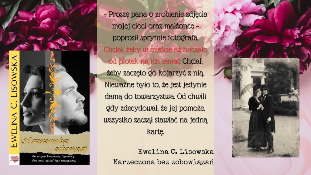 Stali tak dłuższą chwilę. Ciepło jego ręki czuła przez tkaninę jego surduta, podobnie jak temperaturę męskiego ciała, które ogrzewało ją swoją bliskością. I ta druga dłoń, co tak opiekuńczo nakrywała jej rączkę z góry; i do tego uścisk, który trwał nieprzerwanie… „Dlaczego nie zaprzeczył, że jesteśmy razem?” Nie ruszała się, tak jak kazał fotograf, i roiła w swojej głowie najróżniejsze scenariusze i powody jego zachowania.