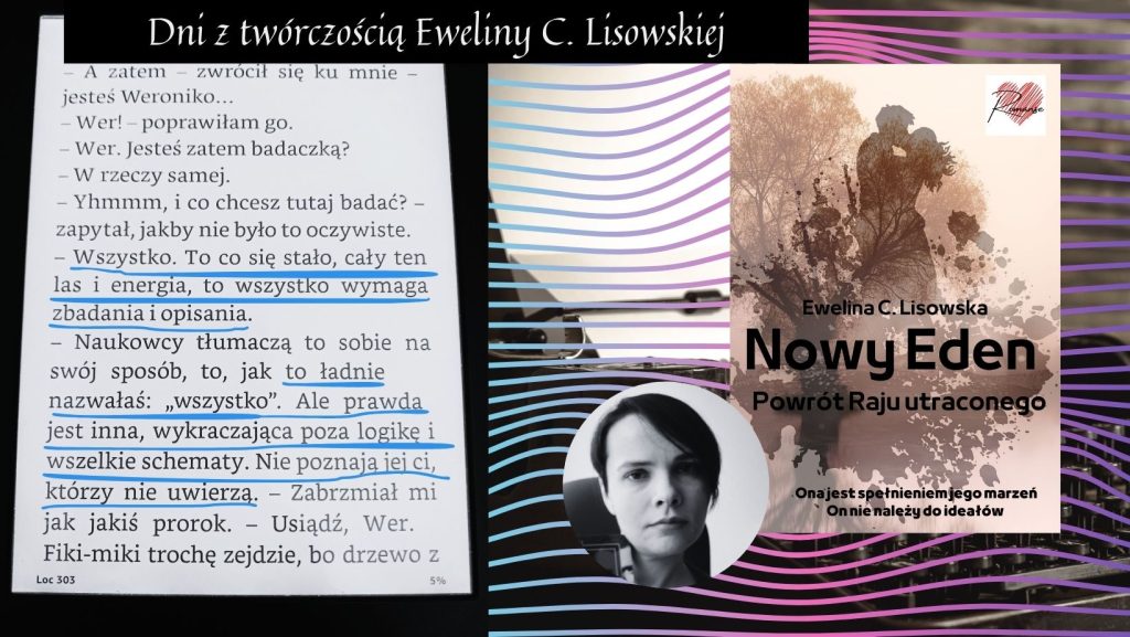 Kolejny dzień z twórczością Eweliny C Lisowskiej. To już dziewiąte spotkanie! Dziś omówimy bardzo nietypową książkę, w której zaskakuje nie tylko obfitość gatunków. NOWY EDEN to przede wszystkim piersza powieść autorki w podgatunku scienc-fiction romans. I pierwsza powieść opublikowana pod logiem Wydawnictwa Romanse. A w zeszłym tygodniu rozmawialiśmy o KRÓLOWEJ ŻEBRAKÓW.