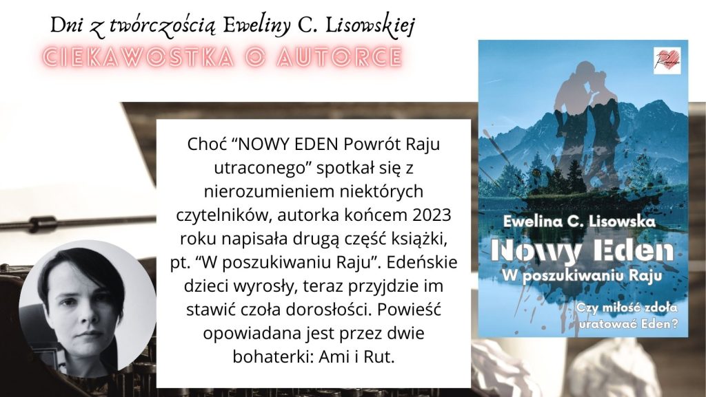 Choć “NOWY EDEN Powrót Raju utraconego” spotkał się z nierozumieniem niektórych czytelników, autorka końcem 2023 roku napisała drugą część książki, pt. “W poszukiwaniu Raju”. Edeńskie dzieci wyrosły, teraz przyjdzie im stawić czoła dorosłości. Powieść opowiadana jest przez dwie bohaterki: Amandę i Rut. Każda z nich opowiada nam swoją miłosną historię, a ich dwa osobne wątki łączą się potem w spójną fabułę i nie mogą już bez siebie funkcjonować. Nowy Eden odszedł w zapomnienie, przyszedł więc czas na to, aby go odnaleźć – czym zajmie się Rut. Ale czy jej się uda? O tym możecie przeczytać tylko w drugiej części książki, która ukaże się w najbliższych latach.