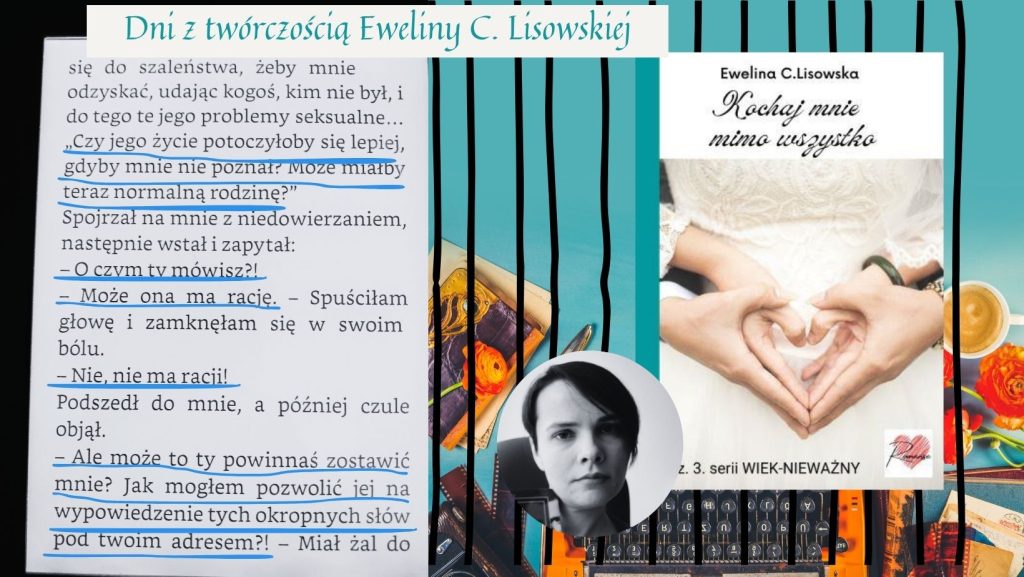 KOCHAJ MNIE MIMO WSZYSTKO to trzecia część cyklu WIEK-NIEWAŻNY. W pierwszej części pt. Szukając siebie poznajemy Kasię, która zmaga się z depresją. Darek próbuje się do niej zbliżyć, ale choroba dziewczyny przesłania jej cały świat. Druga część Powroty pokazuje więcej o Darku, który również zmaga się przez cały czas z problemami. Triada problemów: depresja, problemy seksualne i endometrioza… To z pewnością nie jest typowa seria romansów współczesnych. Seria pokazuje, że nawet największe problemy można przezwyciężyć. Ale jak? Dowiesz się, czytając serię WIEK-NIEWAŻNY Eweliny C. Lisowskiej.