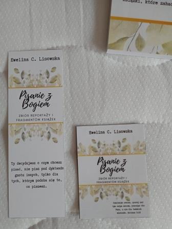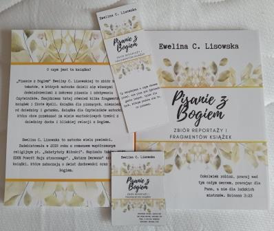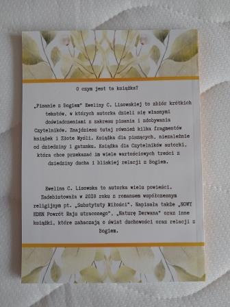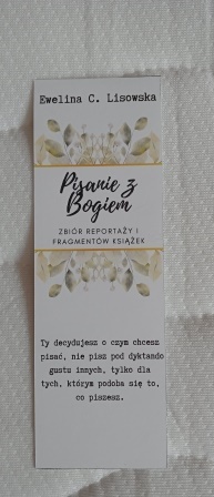 Najważniejsza książka w całej twórczości Eweliny C. Lisowskiej, autorki wielu romantycznych książek. Co wspólnego ma Bóg z jej twórczością? Autorka zaprasza do prześledzenia początków jej ścieżki pisarskiej. PISANIE Z BOGIEM to zbiór reportaży, które przedstawiają krótką historię rozwoju pisarki. Jest w niej wiele wartościowej treści, która może pomóc początkującym autorom/autorkom. Jest to także szkic duchowej, bliskiej relacji Eweliny C. Lisowskiej z Bogiem, którego nazywa swoim Przyjacielem. Książka podzielona jest na cztery części: Reportaże, O Bogu w moich książkach, Fragmenty Książek i Złote Myśli – z których powstał MOTYWATOR PISARSKI (zestaw magnesów z radami dla pisarzy).